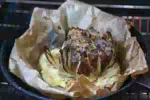 10. Прикрыть луковицу фольгой и запекать в заранее разогретой до 190С духовке примерно 30 минут. Затем убрать фольгу и продолжать запекать еще около 20 минут, чтобы луковица хорошо подрумянилась. Если хотите, посыпьте фаршированный тертым сыром или дополнительно полейте оставшимся кляром. Будет еще вкуснее. За 50 минут лук должен точно пропечься, если луковицы были не очень большие. Цветок из фаршированного лука переложите на тарелку и сразу подавайте на стол.