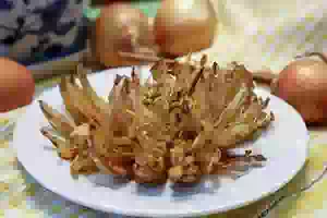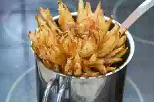 12. Продолжить жарить луковицу еще примерно 5 минут, чтоб лепестки хорошо подрумянились и стали хрустящими. Можете в процессе жарки во фритюре луковицу периодически переворачивать, чтобы она равномерно обжарилась со всех сторон. В общей сложности на жарку луковицы весом около 250г ушло около 10 минут. Готовую хризантему из жареного лука переложить на тарелку, застеленную бумажным полотенцем. И начать готовить вторую луковицу. Подавать лучше сразу, пока лук горячий и аппетитно хрустит.