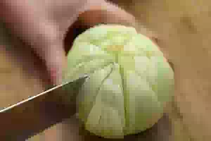 1. Крупные луковицы очистить. У очищенной луковицы срезать верхушку и аккуратно подрезать донце, как на фото. Старайтесь подрезать минимально, чтобы луковица не развалилась на отдельные листочки.