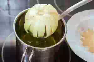 10. К этому времени в глубокой кастрюлю (у меня ковшик для молока) разогреть растительное масло. Переложить луковицу на шумовку и осторожно опустить луковицу в горячее масло лепестками вниз. Масло должно полностью покрывать луковицу.