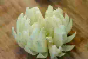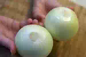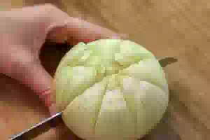 1. Крупные луковицы очистить. У очищенной луковицы срезать верхушку и аккуратно подрезать донце, как на фото. Старайтесь подрезать минимально, чтобы луковица не развалилась на отдельные листочки.