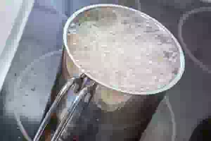 10. К этому времени в глубокой кастрюлю (у меня ковшик для молока) разогреть растительное масло. Переложить луковицу на шумовку и осторожно опустить луковицу в горячее масло лепестками вниз. Масло должно полностью покрывать луковицу.