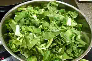 3. Эскарол должен быть уже хорошо промыт. Мыть надо тщательно, в нескольких водах, потому что земля забивается в основание листьев. Порезать его не мелко, у меня кусочки сантиметра по 3-4 шириной.