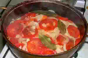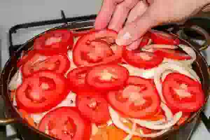 2. Слоями уложить овощи в казан (или любую большую толстостенную посуду) чередуя помидоры, репчатый лук, морковь, перец, баклажаны, затем опять перец, морковь, лук и помидоры. Каждый слой чуть присыпать солью и молотым перцем, сверху посыпать сахаром, уложить лавровый лист и тонко нарезанный чеснок.