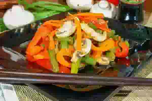 5. Добавить в сковороду морковь, жарить на сильном огне, встряхивая периодически сковороду, примерно 30 секунд. Добавить перец, стручковую фасоль и грибы. Жарить, помешивая, на сильном огне минуты 2.