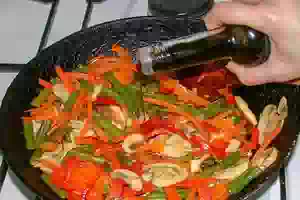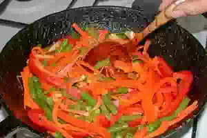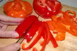 1. Подготовить овощи. Перец разрезать пополам, удалить перегородки и зернышки, вымыть и нарезать тонкими полосками.