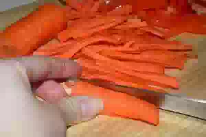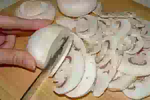 3. Шампиньоны протереть салфеткой (если надо, промыть), со шляпок снять кожицу. Грибы нарезать тонкими пластинками. У стручков фасоли обрезать кончики и стручки разрезать на небольшие отрезки.