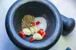 2. Пока варится картошка, приготовить соус мохо. Рецепты мохо различаются, сегодня будет готовить так. В ступку сложить очищенные зубчики чеснока, нарезанный перец чили (вместе с семенами), кумин, молотый черный перец и 1 ч.л. крупной соли. Растереть пестиком в кашицу.