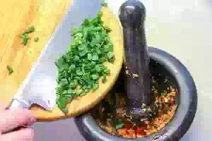 3. Добавить нарезанный зеленый лук, продолжать растирать до получения кашицы. По желанию примешать сушеный базилик и орегано.