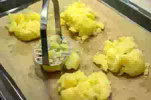 7. Переложить недоваренный картофель на застеленный пекарской бумагой противень. Каждую картофелину придавить толкушкой.