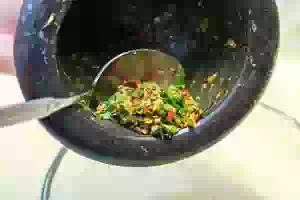 2. Пока варится картошка, приготовить соус мохо. Рецепты мохо различаются, сегодня будет готовить так. В ступку сложить очищенные зубчики чеснока, нарезанный перец чили (вместе с семенами), кумин, молотый черный перец и 1 ч.л. крупной соли. Растереть пестиком в кашицу.