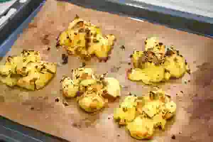 7. Переложить недоваренный картофель на застеленный пекарской бумагой противень. Каждую картофелину придавить толкушкой.