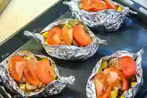 8. Поверх картофеля с мясом выложить по несколько долек сочных спелых помидоров. Перенести лодочки из фольги с картошкой, мясом и помидорами на противень и поставить запекаться в разогретую до 190С духовку примерно на 40 минут. Точно время приготовления блюда зависит от вашей духовки. Мясо с картофелем, запеченное в фольге можно подавать прямо в лодочках.