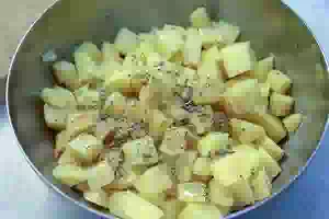 2. Нарезанный картофель посолить, поперчить, приправить сушеным розмарином, добавить пропущенный через пресс чеснок и полить растительным маслом. Перемешать, чтобы картофель со всех сторон были покрыты маслом с пряностями.