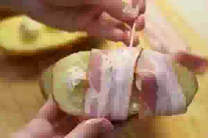 4. Тонкими полосками бекона обернуть картофельные половинки, прижимая кусочки сырного масла. В зависимости от длины полосок бекона и размера картофеля, на каждую картофельную половинку потребуется по 1 или 2 полоски бекона. Кончики бекона можно закрепить деревянной зубочисткой, чтобы бекон не развернулся в духовке под действием высокой температуры.