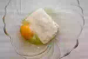 2. Добавить к творогу яйцо и сахар. Размешать до однородности.