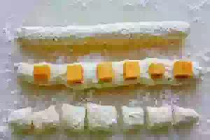 3. Подсыпать к творожной массе муку и размешать до получения мягкого теста. Очищенный от кожуры и семян кусочек тыквы варить буквально 5-7 минут. Затем переложить на тарелку, остудить и порезать маленькими кубиками.