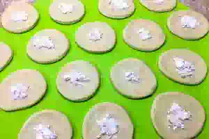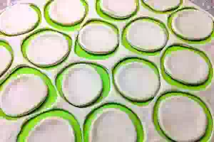2. Раскатываем его в тоненький пласт. Стаканом вырезаем небольшие кружки одинакового размера.