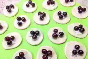 4. Сверху на крахмал кладем по 3 вишни (лучше из ягод удалить косточки).