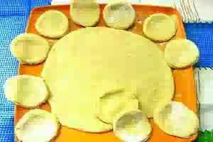 2. Делим тесто на небольшие кусочки, раскатываем и подготавливаем заготовки в виде кружков одинакового диаметра.