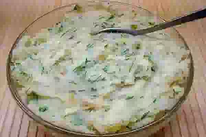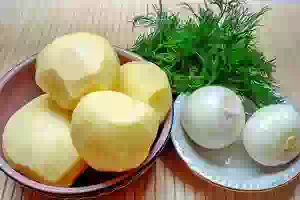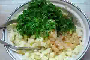 7. Отварить картофель, посолить. Измельченный лук обжарить. Лучше это сделать на растительном масле. В картофельное пюре добавить зажарку, рубленый укроп.