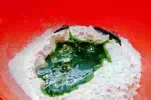 5. Для приготовления зеленого теста просеять муку. Добавить все ингредиенты, только масло разделить поровну - оно еще понадобится для белого замеса. Замесить тесто, начав вымешивание ложкой и продолжив руками.