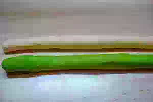 Раскатать 2 разноцветные колбаски из теста, которые должны быть одной длины.