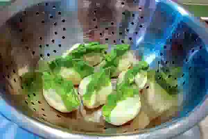 17. Варить вареники на пару, предварительно смазав решетку растительным маслом. 10 мин. - оптимальное время для варки. Сваренные таким способом, вареники отличаются блестящей поверхностью и вовсе не разваливаются. Если же отварить их просто в воде, они будут так же вкусны, но потеряют свой глянцевый блеск. Подают вареники, сдобрив их жирной сметаной или острым соусом.