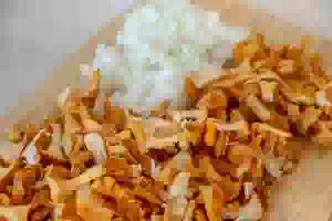 1. Приготовление штруделя стоит начать с начинки. Для этого промытые и обсушенные на полотенце лисички крупно порубить (мелкие лисички можно оставить целыми). Репчатый лук мелко порезать.