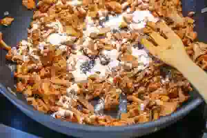 3. Влить в сковороду с лисичками сливки, проварить на слабом огне не больше 1 минуты и снять с плиты. Приправить молотым мускатным орехом. Начинка для грибного штруделя готова.