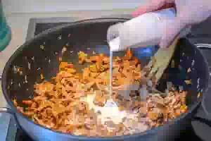 2. В сковороде разогреть немного растительного масла, добавить измельченный лук и пассеровать до прозрачности. Добавить к пассерованному луку лисички и обжаривать их до тех пор, пока из них выпарится вся жидкость. Когда лисички подрумянятся, посолить, поперчить их по вкусу, а затем посыпать грибы мукой. Перемешать и подержать на сковороде 1-2 минуты.