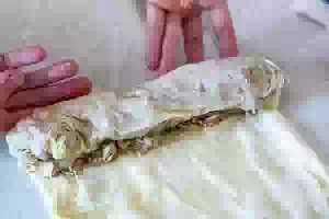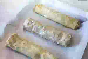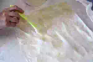 4. Готовые листы фило вынимать из рулончика по одному. Первый лист теста положить на рабочую поверхность и смазать с помощью кулинарной кисточки предварительно растопленным сливочным маслом. На время работы с тестом упаковку с фило надо накрыть влажным полотенцем. Положить первый лист второй, снова промазать сливочным маслом и так продолжать, пока не получим слой из 5-ти листов.