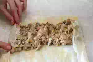 5. Остывшую начинку из лисичек выложить на 1 край прямоугольника теста, затем подвернуть свободные концы на начинку.