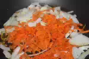 2. А пока оно набухает лук и морковку очистить. Луковицу нарезать полукольцами, морковь натереть на крупной терке.