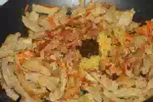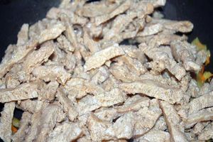 4. После прибавить соевое мясо, не забыв слить с него воду. Обжаривать, помешивая, 2-3 минуты.