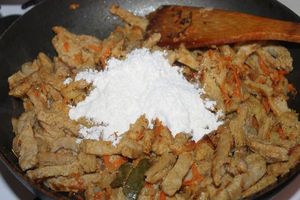 5. После обжарки соевого мяса добавляем соль, сахар, лавровый лист, аджику, любую приправить на свой вкус.
