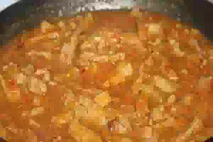 8. и влить примерно холодной 350 мл воды. Аккуратно все перемешать, дождаться, когда содержимое сковороды закипит, уменьшить огонь до минимума и тушить 15 минут, прикрыв крышкой. Горячий гуляш из соевого мяса в томатном соусе разложить по тарелкам и можно звать всех к столу.