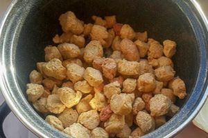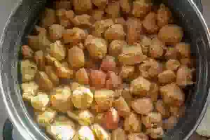 1. Кусочки соевого мяса залить теплой водой. Лучше всего это делать в большой емкости, например, в кастрюле.