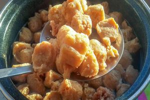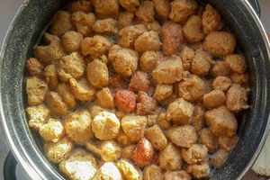 3. Размоченное соевое мясо вытащить из воды с помощью шумовки. Если с кусочков будет немного стекать вода - ничего страшного. Она выпарится в процессе готовки.