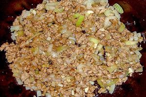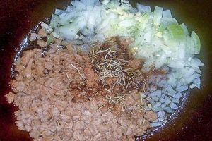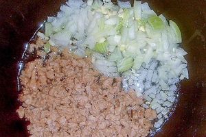 1. Соевый фарш приготовить согласно инструкции на упаковке. Лук и два зубчика чеснока измельчить. Перец чили нарезать соломкой. Фасоль откинуть на дуршлаг и дать стечь. Томаты вынуть из сока и нарезать. В масле обжарить лук, чеснок и соевый фарш.