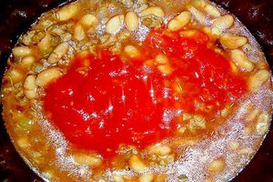4. Добавить томатную пасту и тушить 10 минут, затем добавить фасоль и помидоры. Тушить до готовности, примерно ещё минут 10. Зубчик чеснока измельчить, смешать с майонезом, посолить и поперчить по вкусу. Готовое блюдо подавать горячим с зеленью и майонезом. Получается довольно нажористо, но при том, совершенно постно!