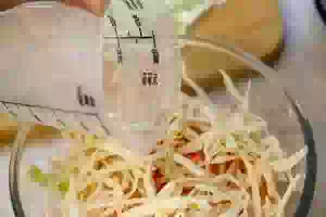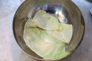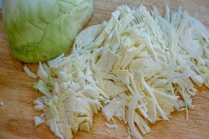 1. У капусты удалите верхние листья. Отложите в сторону несколько целых листьев, они понадобятся позже. Остальную часть капусты тонко нашинкуйте.