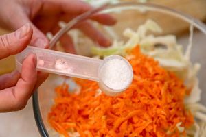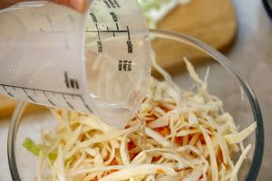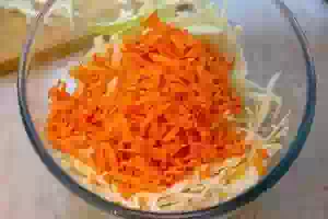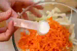 3. В миску подходящего объема сложите капусту и морковь, добавьте соль и сахар. Перемешайте, пожамкайте руками, чтобы капуста стала чуть мягче.