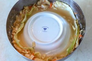 Оставьте капусту при комнатной температуре на 3-4 дня. Уже на второй день будет заметно выделение сока и брожение. Обязательно проткните капусту деревянной шпажкой (или палочками для суши) до самого дна, чтобы можно пробовать капусту. Если в комнате теплее обычного, то брожение начнется быстрее. Если прохладно, то пусть постоит еще 1-2 дня. Готовую квашеную капусту с ржаной мукой переложить в банку и хранить в холодильнике.