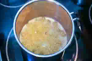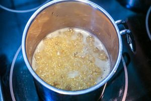 2. Промытую крупу пересыпать в кастрюлю и залить 2 стаканами холодной воды. Довести воду до кипения, посолить, снизить огонь до умеренного и варить пшенку до готовности. Снять кастрюлю с плиты и дать вареной пшенке остыть.