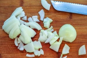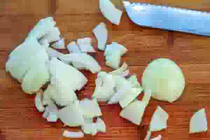 3. Пока остывает вареная пшенка, очистить репчатый лук и произвольно порезать.