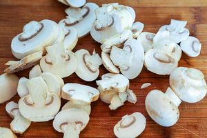 4. Свежие шампиньоны протереть влажной салфеткой, подрезать ножки и порубить пластинками. Если готовите крупеник с замороженными шампиньонами, то грибы заранее размораживать не надо.