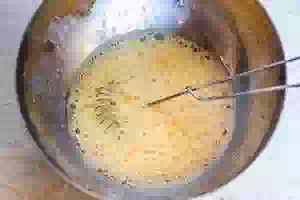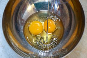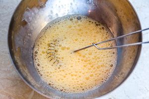 7. В отдельной миске взбить венчиком яйца. Посолить по вкусу.