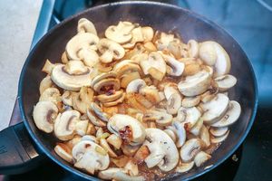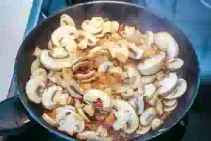 6. В сковороде разогреть 1-2 ст.л. растительного масла и пассеровать лук. Добавить к луку нарезанные шампиньоны и жарить до готовности. Сковородку с жареными грибами снять с плиты и дать им остыть.