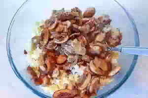 8. Смешать вареную на воде пшенную кашу, грибы с луком и залить взбитыми яйцами. Посолить по вкусу и аккуратно перемешать.